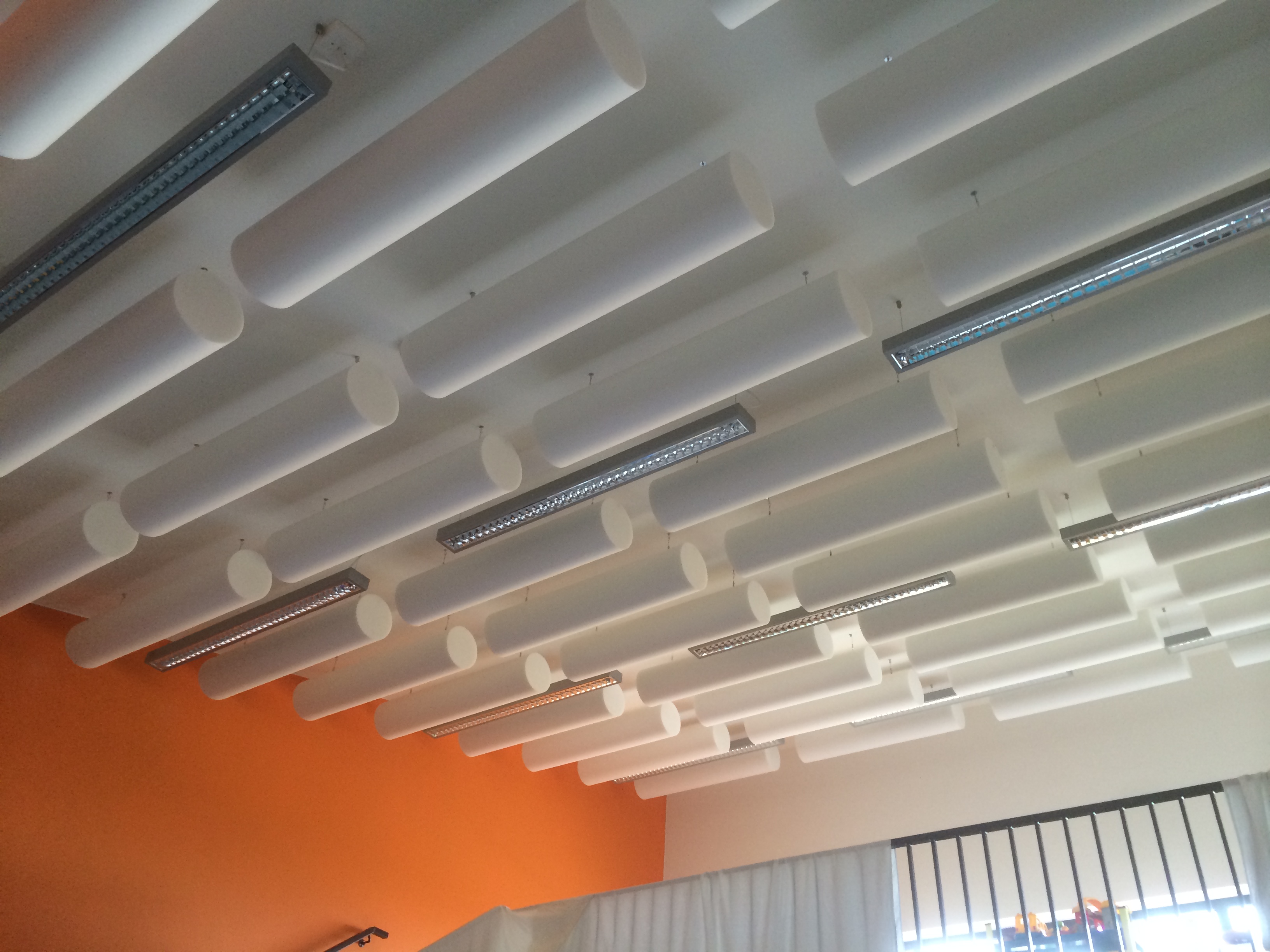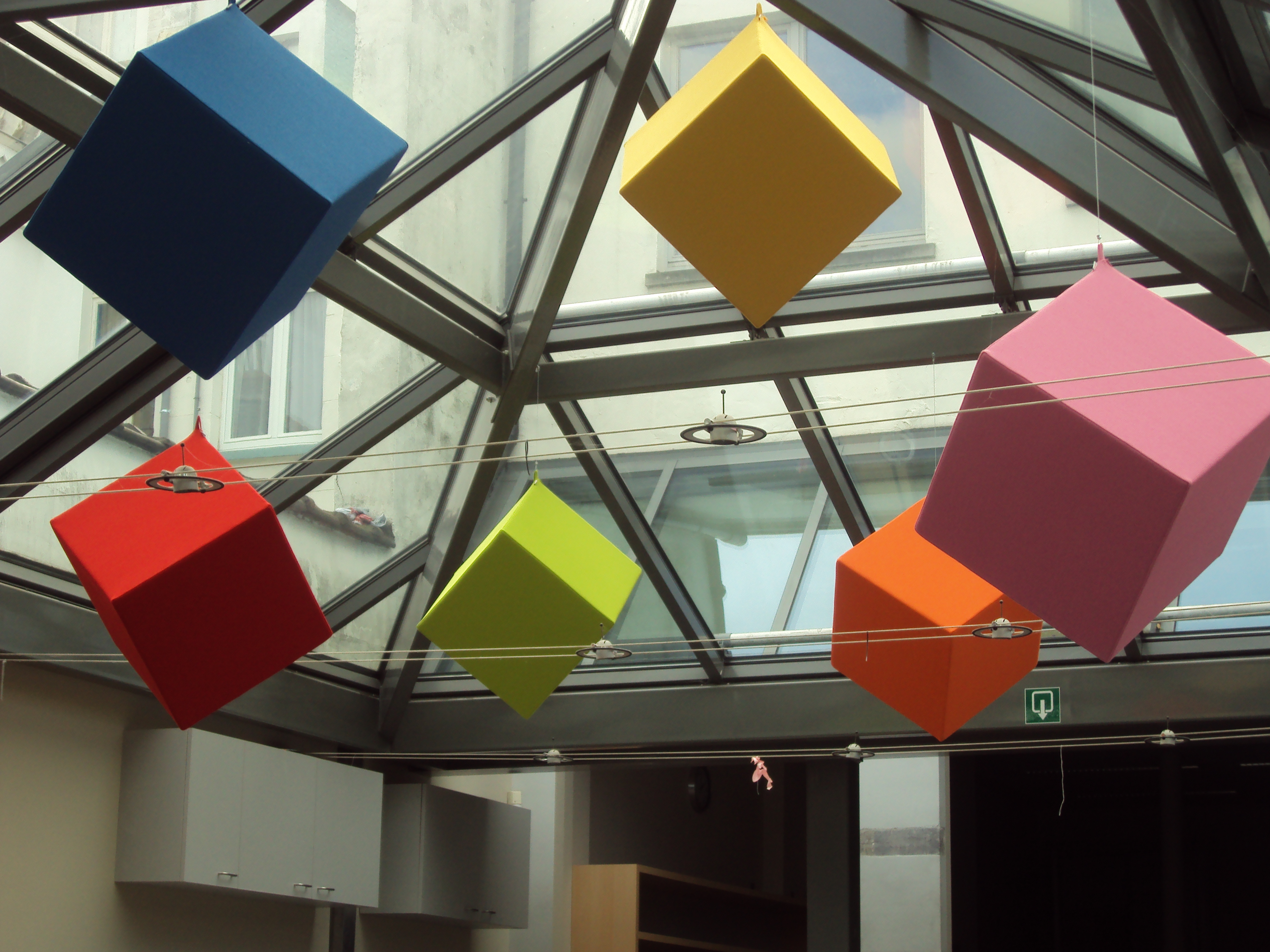 - D-sound panelen omgeven door een textiel in kleur naar keuze, opgehangen met staalkabels.